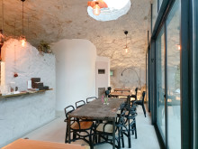 店舗面積は約15坪。席数はテーブル席18席。自宅兼店舗の建物は、白色を基調に洞窟のような壁や天井を施した内装が特徴。仙台を拠点に、自然素材を生かしたオリジナル家具のデザインや、店舗、住宅などの設計・施工を手がける建築家・尾形欣一さんのギャラリー「OGATA YAMA(オガタヤマ)」(宮城県仙台)と同じデザインを採用した。玲子さんがインターネットで同アトリエを知り、建築デザインに引かれたことから、約1年かけて施工したという。入り口には、美瑛町の「白金青い池」(北海道美瑛町)をイメージした池を施した。