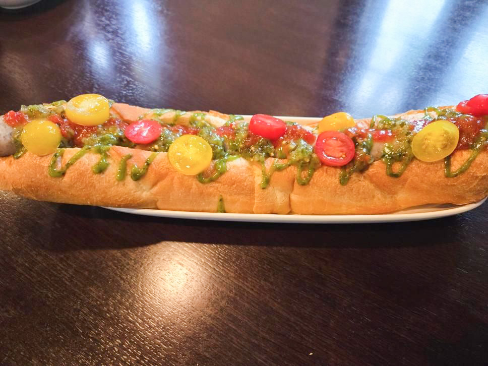 ロングソーセージを挟んだ長さ約45センチのホットドッグ